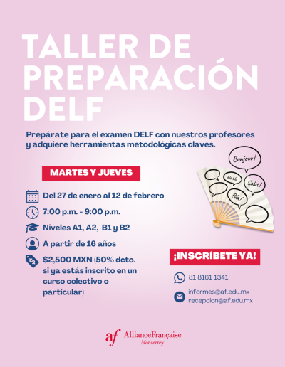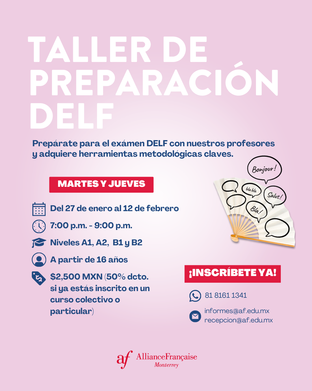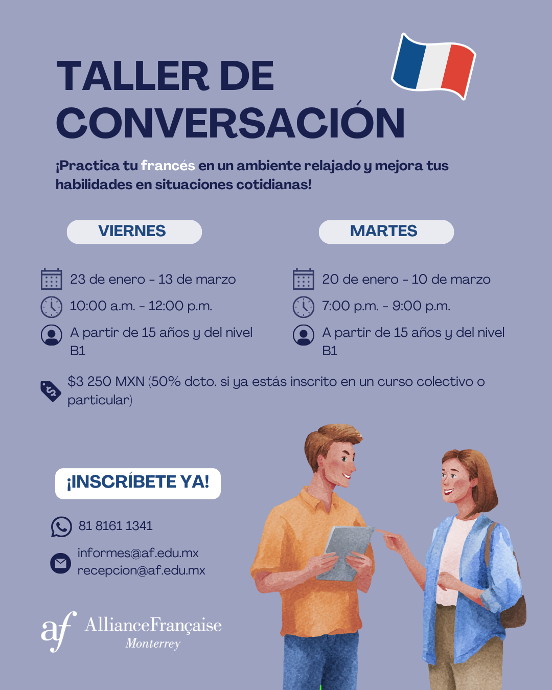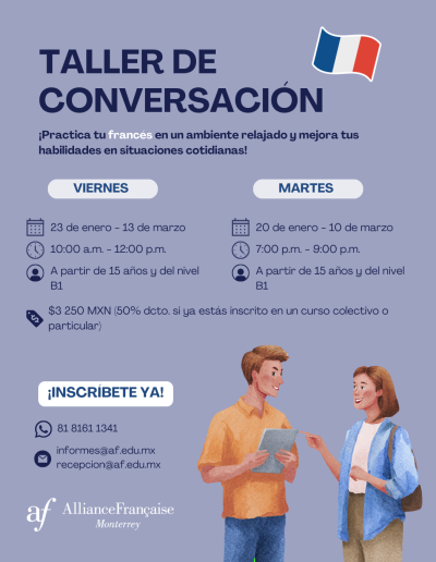 En la Alianza Francesa de Monterrey, te ofrecemos una variedad de talleres especialmente diseñados para perfeccionar tus habilidades en francés y ayudarte a alcanzar tus objetivos lingüísticos. Con profesores altamente capacitados y un enfoque práctico, nuestros talleres son el complemento ideal para quienes desean dominar el idioma.